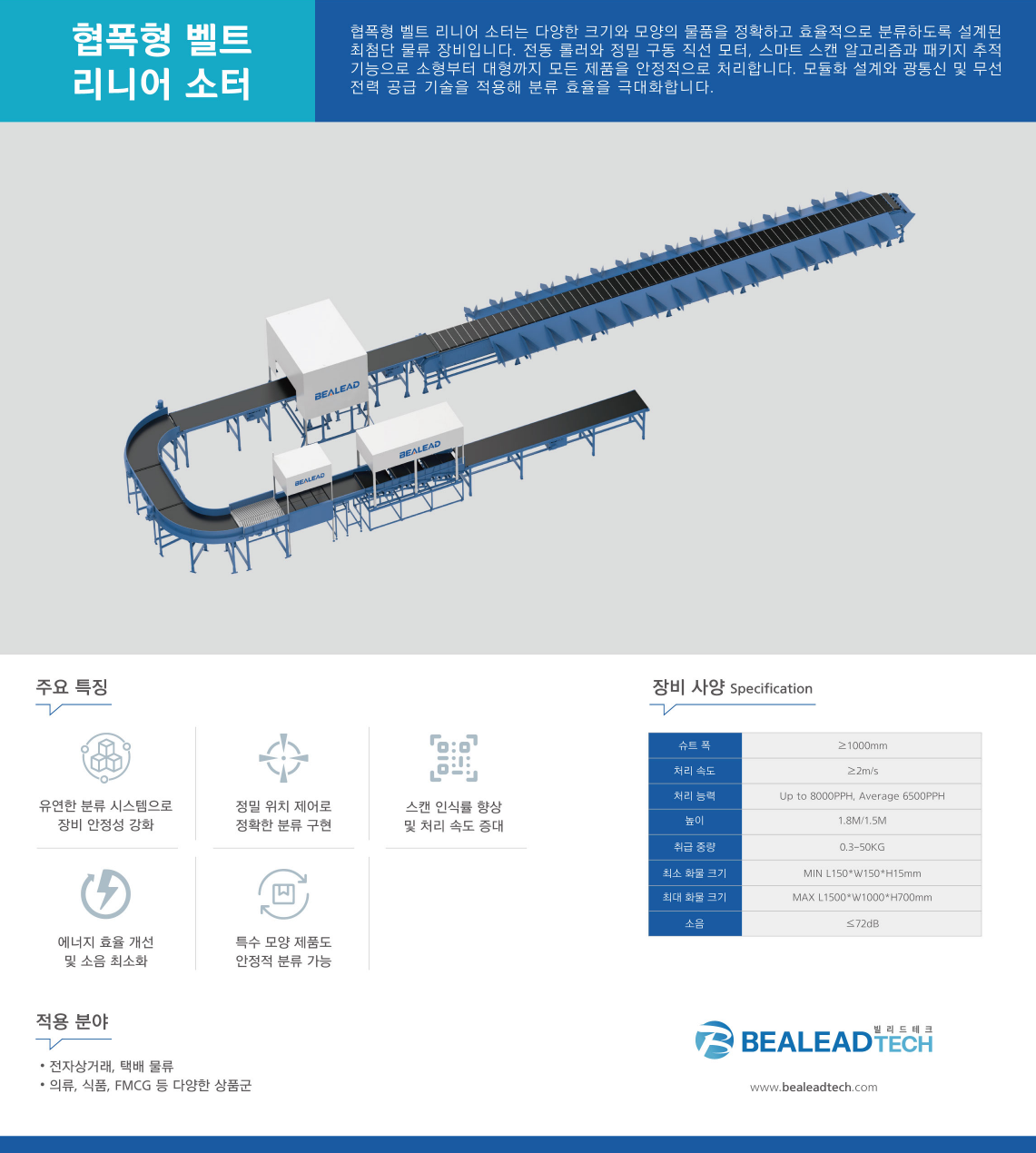 협폭형 벹르 리니어 소터는 다양한 크기와 모양의 물픔을 정확하고 효율적으로 분류하도록 설계된 최첨단 물류 장비입니다.